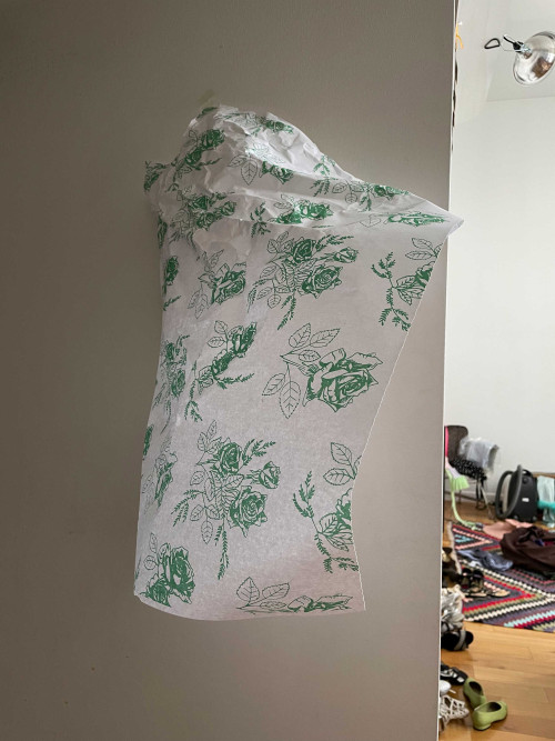 The hanging of its paper wrapping to a wall.