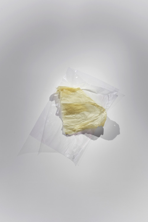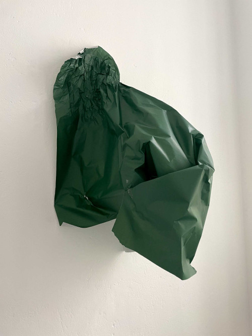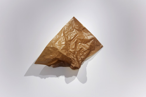 The artist has accumulated and collected a lifetime of Configurations, now in documentation form: photographs, developing an extensive archive for this body of work as an ongoing practice. The handled paper, a fragment of commerce, hangs in space as improvisation; its variation is many—the recurring sculptural gesture notes to anti-use, remembrance, and formulaic intervention.