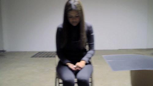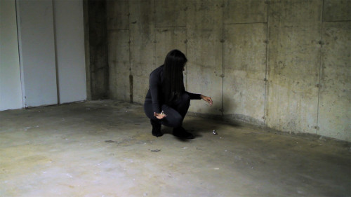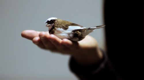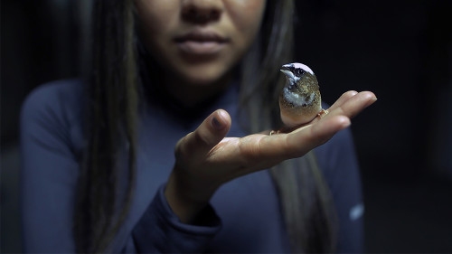 The installation video depicts the artist's contemplative exchange with living birds, capturing an exchange, a moment of intimacy, in a nondescript space where the intersections of a stage are carved out. As these finches mount in her hands, their song explores the ritualistic significance of these remote collective beings. The birds' songs share vocal features as most of the acoustic differences they can achieve are due to the region and parameter of space where they operate. Therefore, the song differs in different areas, like the digital projection. The chamber where the birds were recorded captures their unique choir within the space. Their songs echo throughout the installation.