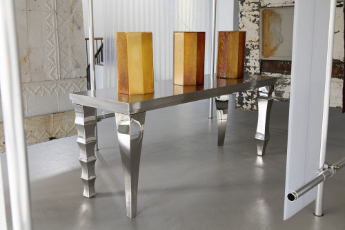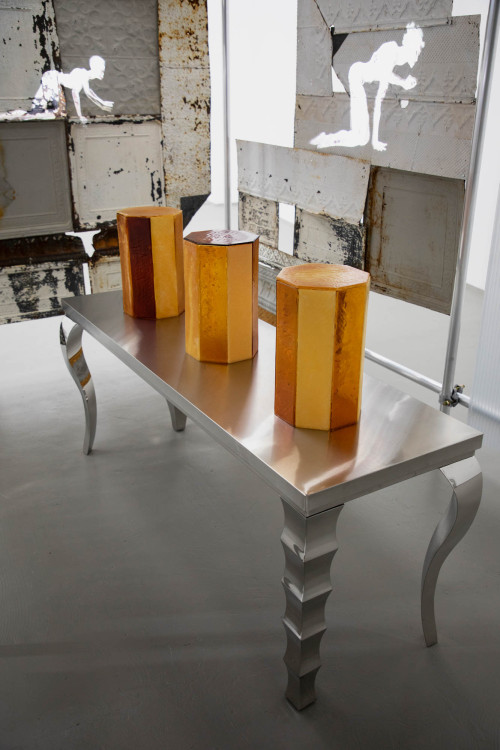 A table of sculptural sugar vessels proposes the commodity in reference to what had been historically the highest-traded product for roughly 400 years. Symbolically, sugarcane notes the transatlantic slave trade at the peak of European colonialism while also illustrating a ceremony on how the global economy came to blossom and its aftermath. Even today, sugar's ritual to pleasure is unrivaled, holding novelties of memory, production, and demand and revealing an unawareness in the active individual participation within unavoidable global markets.