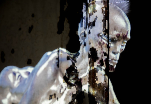 3D Projections of hybrid chimeras surround the inner architecture as the sirens of the sound piece, blended with language and hymn. The score speaks to the complexity of inert cultural systems while offering perspectives on progress, sorrow, and transformation. The renderings allegorically intertwine a narrative between current aesthetics, being products of digital labor, and space they exist within. Their anthropomorphized bodies celebrate and expose the gesture of collective stress, sacrifice, and relief via their choreography.