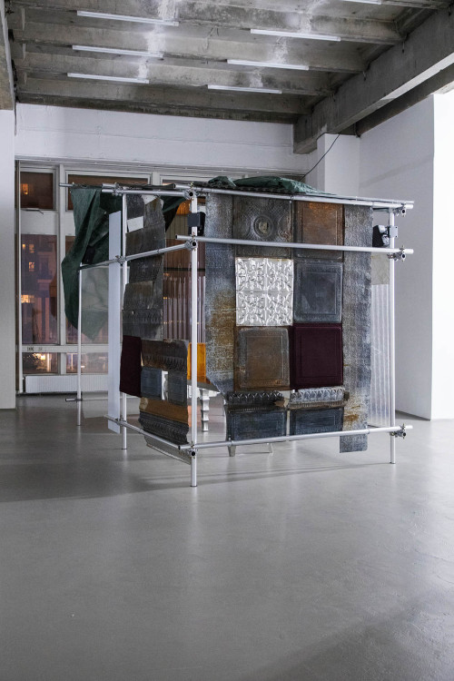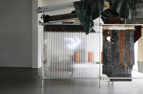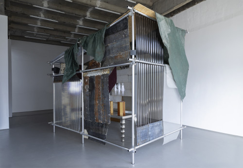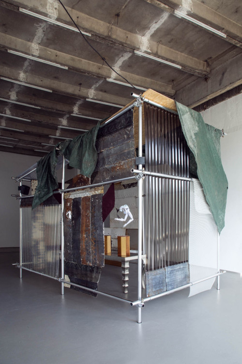 The artwork invites the audience into a shack-like scaffolding construction. The architectural qualities refer to structures built in rapidly changing circumstances with found materials typically determined by purpose, necessity, scarcity, and economic interdependencies. The work's characteristics pay tribute to earthier dwellings primarily omitted by society yet occupying such a large part of our modern world. The patchworked handmade structure stands as an ode to the materials and methods used when access, time, and resources are limited yet are embodied with life, alternatively redefining what it means to be sheltered. In seduce and repulse, the artifact explores the aesthetic qualities of sculpture that triumph and deconstruct the spectrum from shelter to contemporary urbanism, which is erected in both opposition and sympathy to the utilitarian.