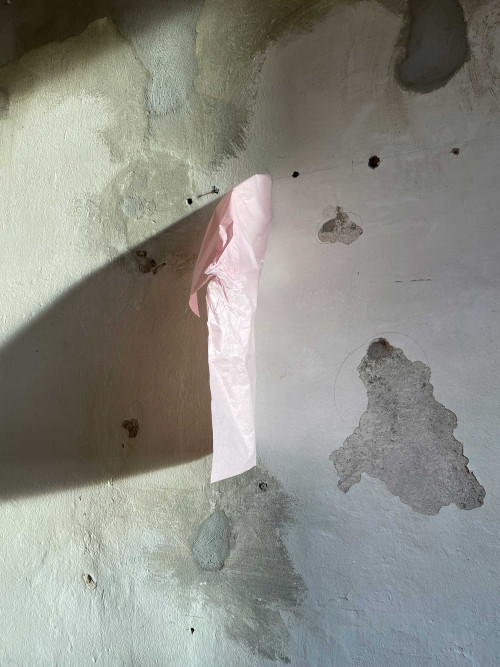 The artist has accumulated and collected a lifetime of Configurations, now in documentation form: photographs, developing an extensive archive for this body of work as an ongoing practice. The handled paper, a fragment of commerce, hangs in space as improvisation; its variation is many—the recurring sculptural gesture notes to anti-use, remembrance, and formulaic intervention.