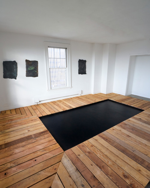 Zero consists of a site-specific floor installation and six wall works, each individually titled and sized, material: mixed media on wood. The Installation was built site-specifically for the Gaylord Fine Arts space. The floor, titled Void, is a custom rectangular pathway surrounding a black recessed area that presents a deep pit and a depressed platform embedded into the lifted floorboards filling the space, created from salvaged wood.