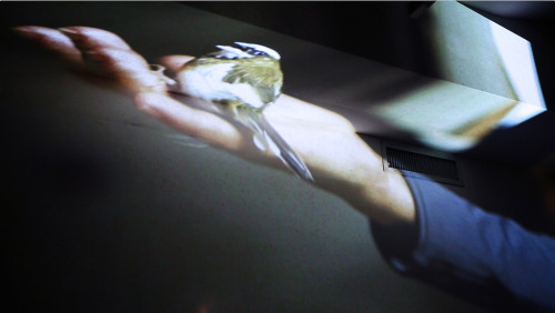 Birds is a multichannel projection-based video/sound piece highlighting a room's unique architectural qualities, consisting of a series of self-portrait videos accompanied by speakers. Dissected moving images fold the footage over room edges, warping content and moving the peripheral surroundings into a digital moment. Arranged video placement accentuates a room's unique structure, illuminating angles, shadows, and unevenness, revealing space itself and manipulating video into the sculptural/physical form.